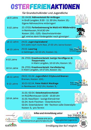 Übersicht über die Osterferienaktionen von dem Kinder- und Jugendbüro Gleichen und dem ev. Familienzentrum Gleichen.